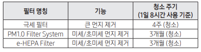 - 청소 주기는 사용 시간과 환경에 따라 달라질 수 있으며, 필터 청소 서비스 요청
