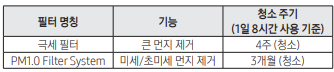 - 청소 주기는 사용 시간과 환경에 따라 달라질 수 있으며, 필터 청소 서비스 요청 시